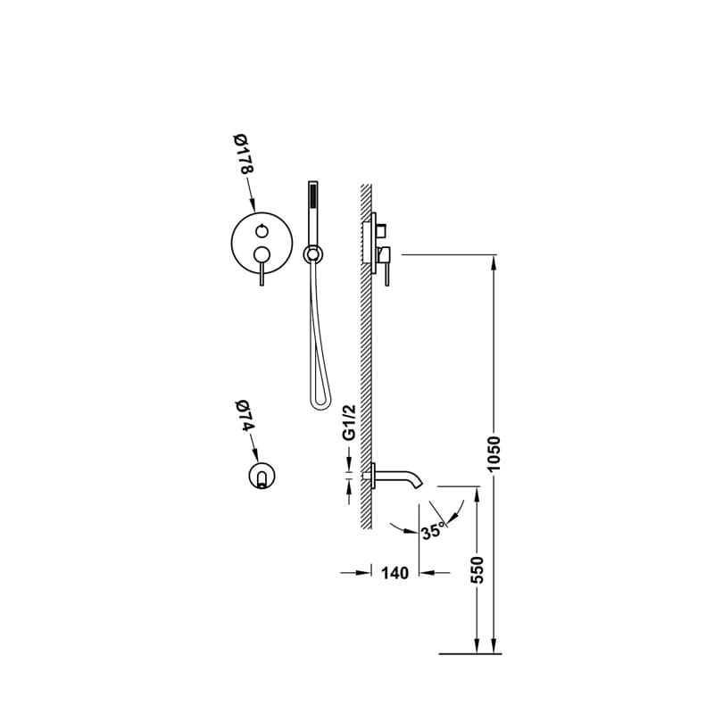 · Caño fijo de bañera a pared.· Soporte para duchade mano con toma de agua a pared.
