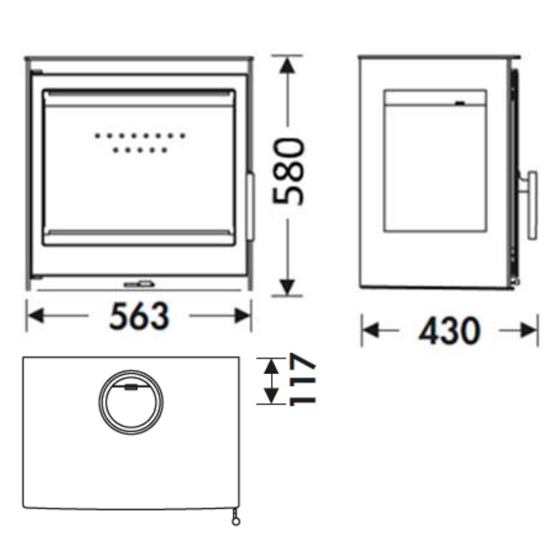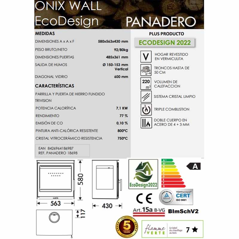 · Dimensiones 58 x 56,3 x 43 cm. · Peso netro 80 kg. · Dimensiones puertas 48,5 x 36,1 kg. · Salida de humos Ø 150 - 153 mm vertical. · Diagonal vidrio 60 cm. · Parrilla y puerta de hierro fundido. · Trivision. · Potencia calorífica 7,1 kW. · Rendimiento 77%. · Emisión de CO 0,10%. · Pintura anticalórica resistente a 800 grados C. · Cristal vitrocerámico resistencia 750 grados C. · Hogar revestido en vermiculita. · Troncos hasta de 50 cm. · Volumen de calefación 220 m3. · Sistema cristal limpio. · Triple combustion. · Doble cuerpo en acero de 4+3 mm.