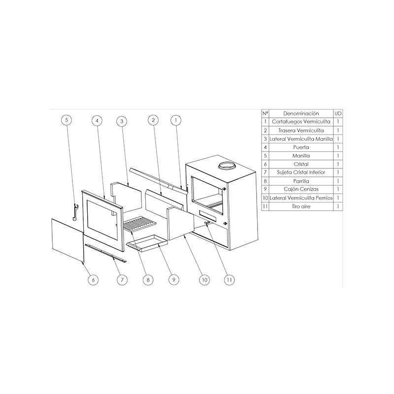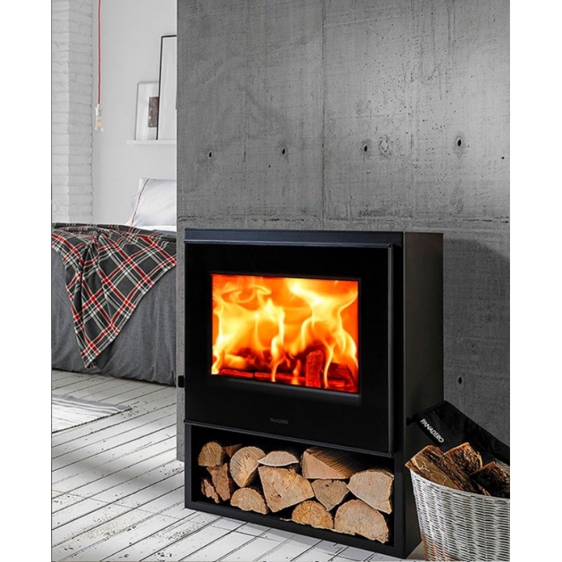 · Cumple con la normativa europea Ecodesign 2022. · Toma de aire exterior. · Revestida en vermiculita con puerta en vidrio serigrafiado. · Se pueden meter troncos de hasta 50 cm. · Triple combustión. · Dispone de leñero. · Parrilla de hierro fundido. · Visión panorámica.