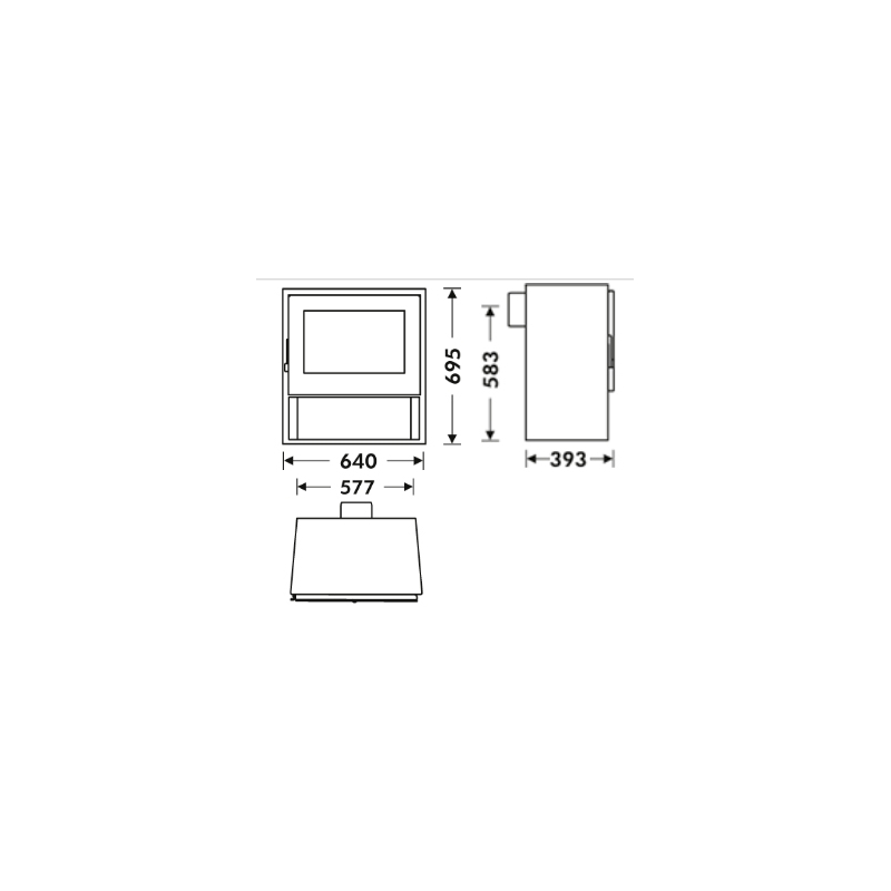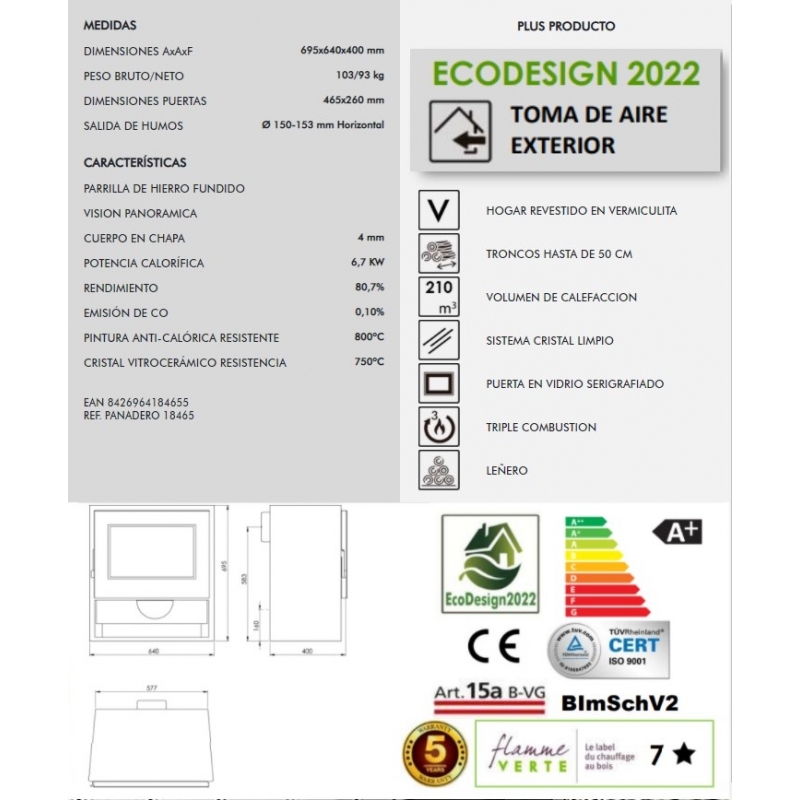 · Dimensiones: 695 x 640 x 400 mm · Dimensiones puerta: 465 x 260 mm · Peso: 93 kg · Salida de humos: ø 150-153 mm, horizontal · Cuerpo en chapa: 4 mm · Potencia calorífica: 6,7 kW · Rendimiento: 80,7 % · Pintura anti-calórica resistente hasta 800ºC · Cristal vitrocerámico resistente hasta 750ºC · Volumen de calefacción: 210 m³