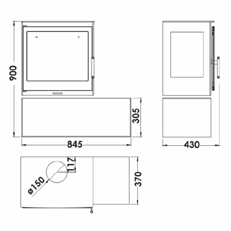 · Dimensiones 90 x 84,5 x 30,5 cm. · Peso neto 125 kg. · Dimensiones puerta 48,5 x 36,1 cm. · Salida de humos Ø 15 - 15,3 cm top. · Parrilla y puerta de hierro fundido. · Potencia calorífica nominal 7,1 KW. · Rendimiento 77%. · Emisión de CO 0,10%. · Pintura anticalorica resistente 800 grados C. · Cristal vitroceramico resistente 750 grados C. · Hogar revestido en vermiculita. · Doble cuepo en acero de 4+3 mm. · Leñero. · Sistema de cristal limpio. · Triple combsustión. · Troncos hasta 50 cm. · Volumen calefacción 220 m3.