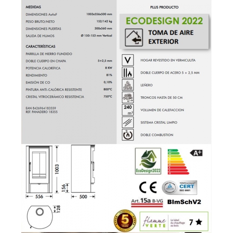 · Dimensiones: 1003 x 556 x 500 mm · Dimensiones puerta: 300 x 560 mm · Peso: 142 kg · Salida de humos: ø 150-153 mm, vertical · Potencia calorífica: 8kW · Rendimiento: 81% · Pintura anti-calórica resistente hasta 800ºC · Cristal vitrocerámico resistente hasta 750ºC · Volumen de calefacción: 240 m³