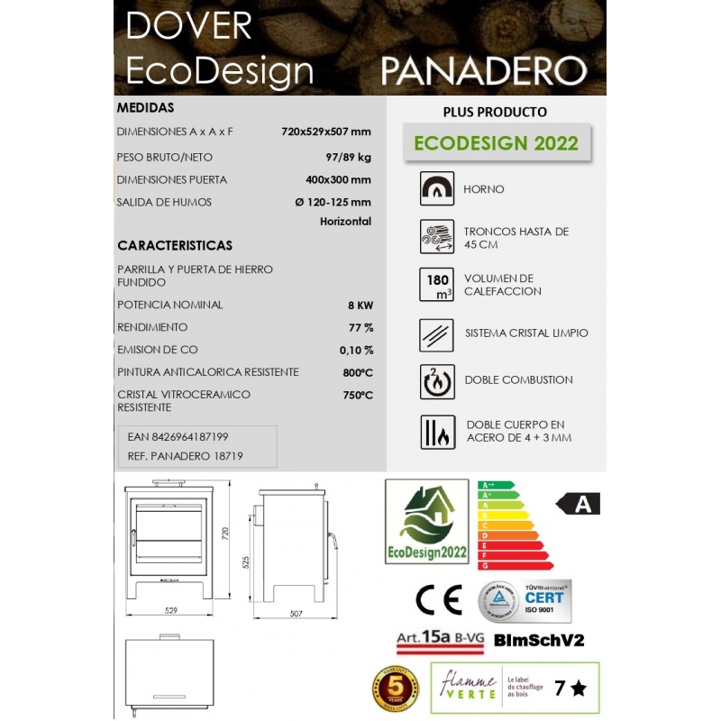 Características técnicas estufa de leña Panadero Dover ECO-Design:
