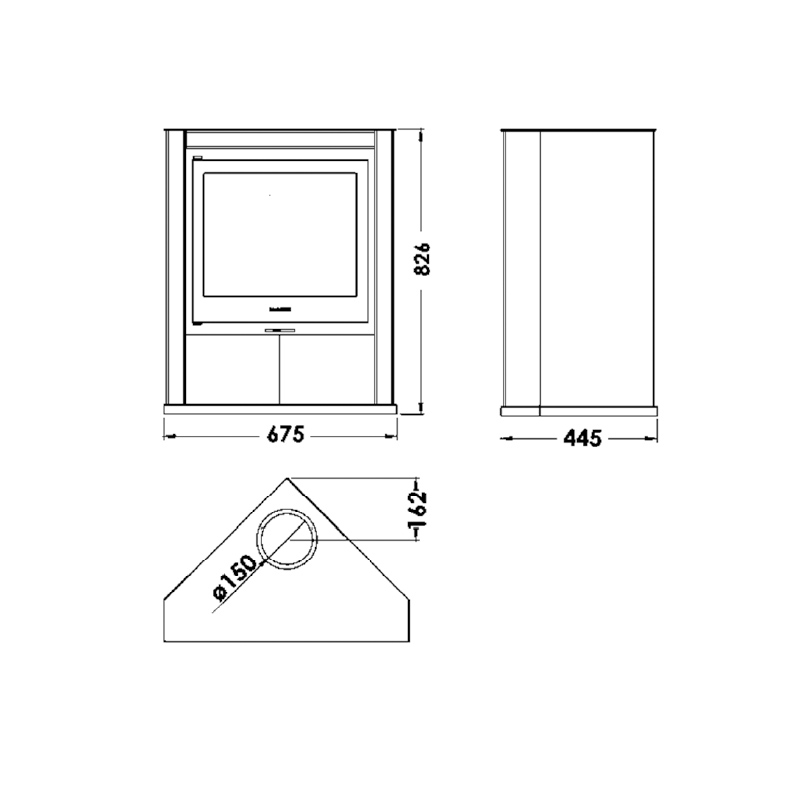 · Medidas 82,6 x 67,5 x 44,5 cm. · Medidas de la puerta 43,2 x 29 cm. · Salida de humos Ø 150 - 153 mm, vertical. · Parilla y puerta de hierro fundido. · Potencia calorífica 6,85 Kw. · Rendimiento 77 por ciento. · Emisión de CO 0,10 por ciento. · Pintura anti-calórica resistente 800 grados. · Cristal vitrocerámico resistencia 750 grados. · Leñero. · Troncos hasta de 60 cm. · Volumen de calefacción 210 m3. · Sistema de cristal limpio. · Triple combustión. · Doble cuerpo de acero de 3 + 4 mm.