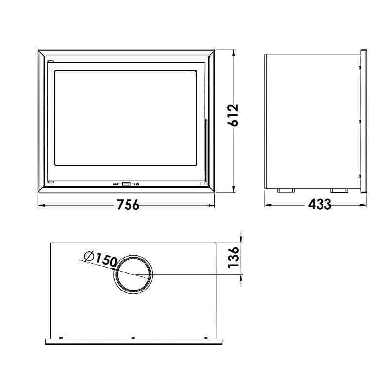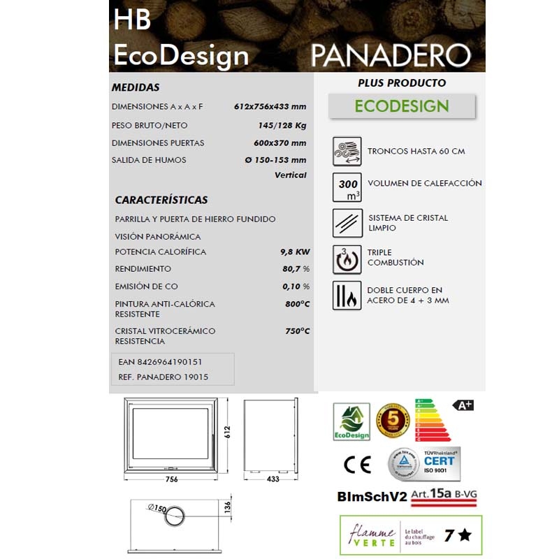 · Medidas 61,2 x 75,6 x 43,3 cm. · Medida de la puerta 60 x 37 cm. · Salida de humos Ø 150 - 153 mm, vertical. · Parilla y puerta de hierro fundido. · Visión panorámica. · Potencia 9,8 Kw. · Rendimiento 80,7 por ciento. · Emisión de CO 0,10 por ciento. · Pintura anticalorica resistente 800 grados. · Cristal vitrocerámico resistente 750 grados. · Troncos de hasta 60 cm. · Volumen de calefacción 300 m3. · Sistema de cristal limpio. · Triple combustión. · Doble cuerpo en acero de 4 + 3 mm.