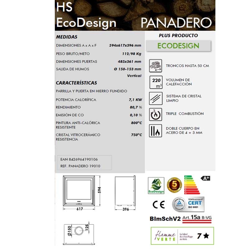 · Medidas 59,4 x 61,7 x 39,6 cm. · Medida de la puerta 48,5 x 36,1 cm, vertical. · Parilla y puerta de hierro fundido. · Visión panoramica. · Potencia 7,1 Kw. · Rendimiento 80,7 por ciento. · Emisión de CO 0,10 por ciento. · Pintura anticalorica resistente 800 grados. · Cristal vitrocerámico resistente 750 grados. · Troncos de hasta 50 cm. · Volumen de calefacción 220 m3. · Sistema de cristal limpio. · Triple combustión. · Doble cuerpo en acero de 4 + 3 mm.