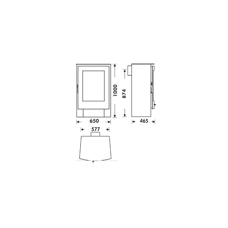 · Potencia nominal: 12,4 kW · Rendimiento: 75,3% · Dimensiones: 1000 x 650 x 465 mm · Dimensiones puerta: 410 x 585 mm · Peso: 141 kg · Salida de humos: ø 150-153 mm, vertical · Cuerpo en chapa: 5 mm · Pintura anti-calórica resistente hasta 800ºC · Cristal vitrocerámico resistente hasta 750ºC · Volumen de calefacción: 380 m³