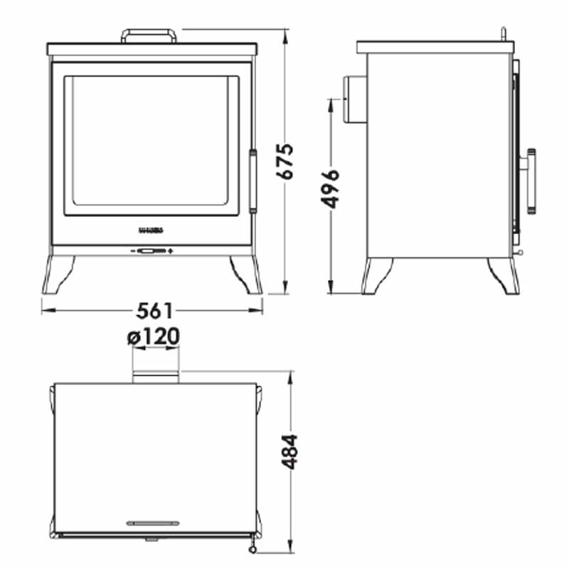 · Dimensiones 67,5 x 56,1 x 48,4 cm. · Peso neto 103 kg. · Dimensiones puerta 40 x 30 cm. · Salida de humos Ø 12 - 12,5 cm horizontal. · Parrilla de hierro fundido. · Potencia calorífica nominal 8 KW. · Rendimiento 77%. · Emisión de CO 0,10%. · Pintura anticalorica resistente 800 grados C. · Cristal vitroceramico resistente 750 grados C. · Volumen de calefación 240 m3. · Troncos hasta de 45 cm. · Horno. · Doble combustión. · Sistema de cristal limpio. · Doble cuerpo de acero de 4 + 3 mm. · Certificado energético A. · ISO 9001.