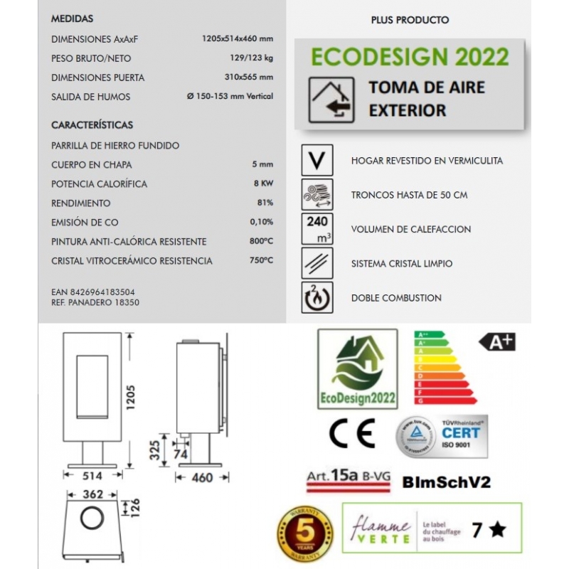 · Dimensiones: 1205 x 514 x 460 mm · Dimensiones puerta: 310 x 565 mm · Peso: 123 kg · Salida de humos: ø 150-153 mm, vertical · Cuerpo en chapa: 5 mm · Potencia calorífica: 8 kW · Rendimiento: 81% · Pintura anti-calórica resistente hasta 800ºC · Cristal vitrocerámico resistente hasta 750ºC · Volumen de calefacción: 240 m³