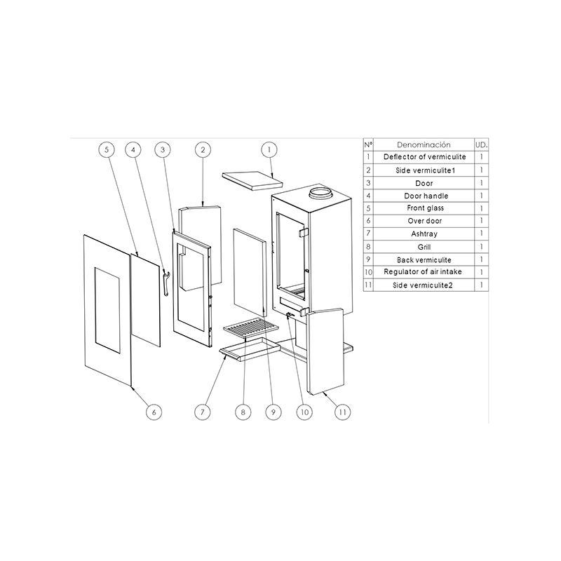 · Cumple con la normativa europea Ecodesign 2022. · Toma de aire exterior. · Revestida en vermiculita. · Se pueden meter troncos de hasta 50 cm. · Doble combustión. · Parrilla de hierro fundido.