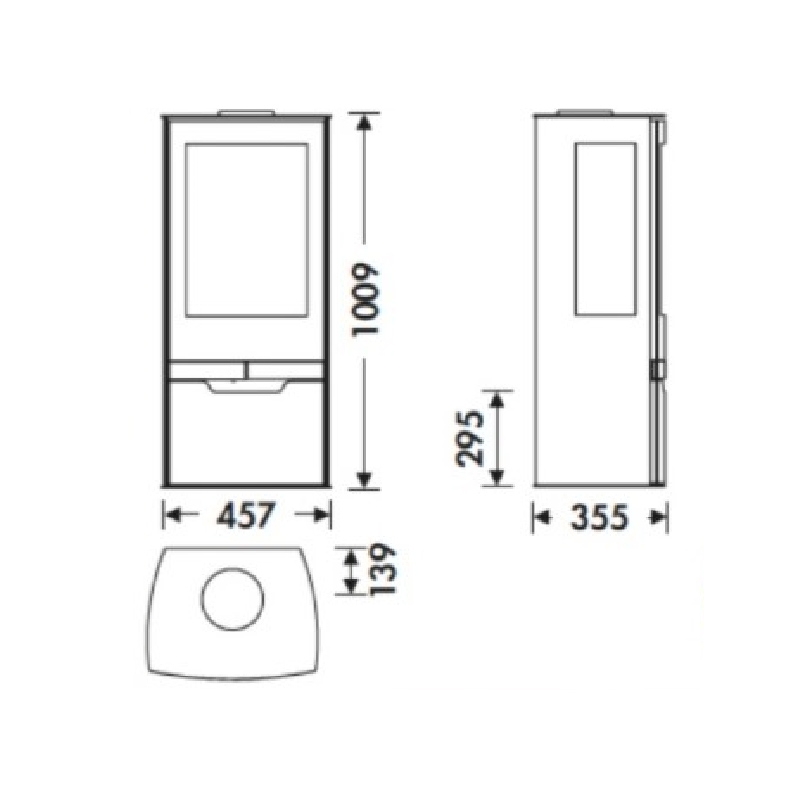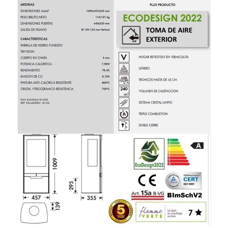· Medidas 100,9 x 45,7 x 35,5 cm. · Medida puerta 44 x 32 cm. · Salida de humos Ø 150 - 153 mm vertical. · Parrilla de hierro fundido. · Trivision. · Cuerpo de chapa 5 mm. · Potencia calorifica 7,9 kw. · Rendimiento 78,4 por ciento. · Emisión de Co 0,10 por ciento. · Pintura anti-calorica resistente 800 grados. · Cristal vitrocerámico resistencia 750 grados. · Toma aire exterior. · Hogar revestido en vermiculita. · Leñero. · Troncos hasta de 45 cm. · Volumen de calefacción 240 m3. · Sistema cristal limpio. · Triple combustion. · Doble cierre.