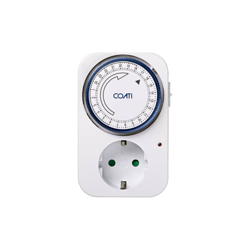 Temporizador compacto diario de nuestra serie Coati, de muy f?cil manejo y configuraci?n, con acabado en color blanco. Se trata de un programador mec?nico que cuenta con un interruptor de 3 posiciones, ON/Auto/OFF, y un sistema de pesta?as con intervalos de conmutaci?n de 15 minutos por cada ciclo.