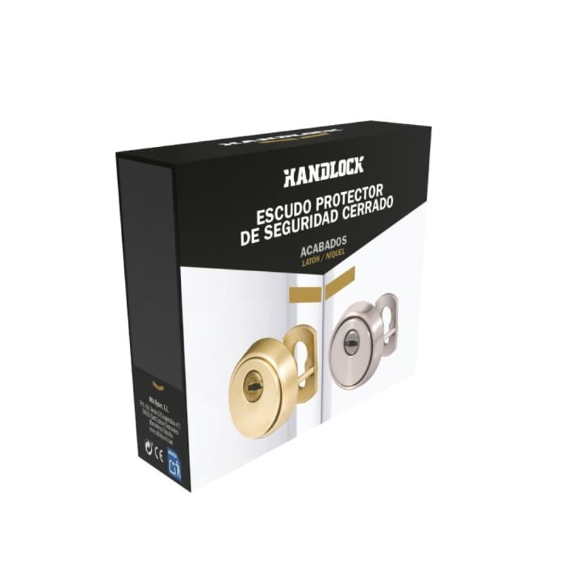 · Escudo de seguridad Handlock. · Acabado en latón, ideal para herrajes en tonos dorados. · Modelo cerrado, que ofrece mayor protección frente a ataques externos. · Refuerza la cerradura y protege el cilindro. · Resistente y apto para puertas de madera o metálicas. · Certificación CE.
