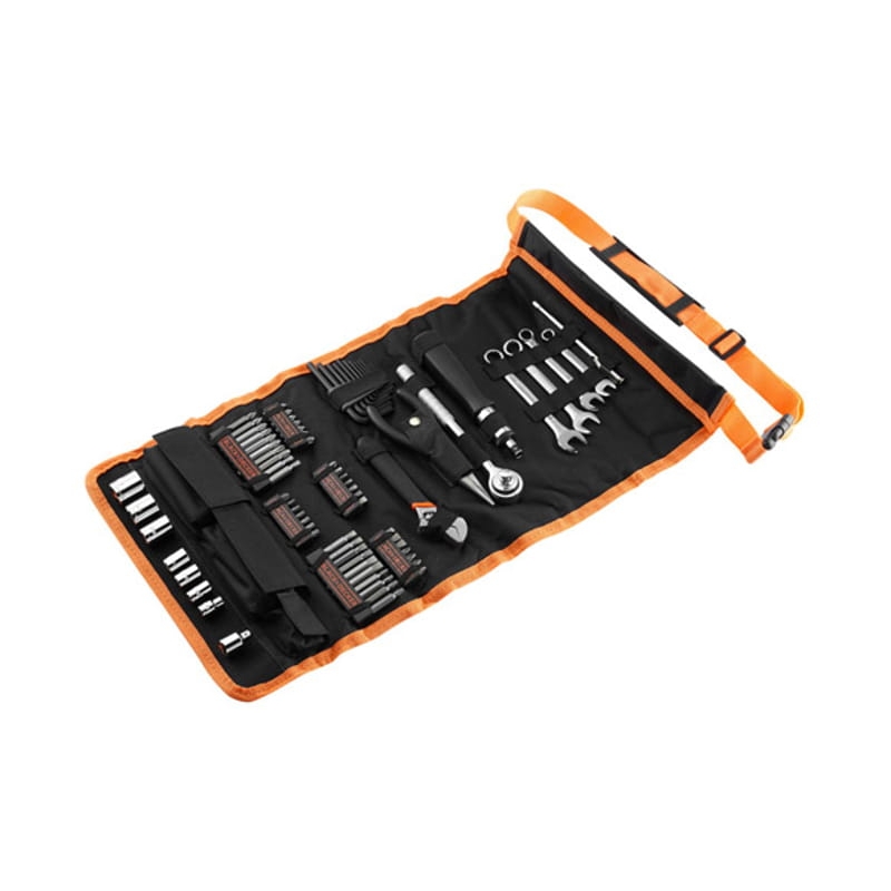 ? Rollo de nylon con 76 herramientas y accesorios para autom?vil y trabajos dom?sticos compuesto por Llave de Carraca reversible, destornillador porta puntas, puntas para atornillar de 25mm y 50mm, Llaves de vaso, Llaves allen, Llaves mixtas, Llave ajustable y Alicate de puntas.