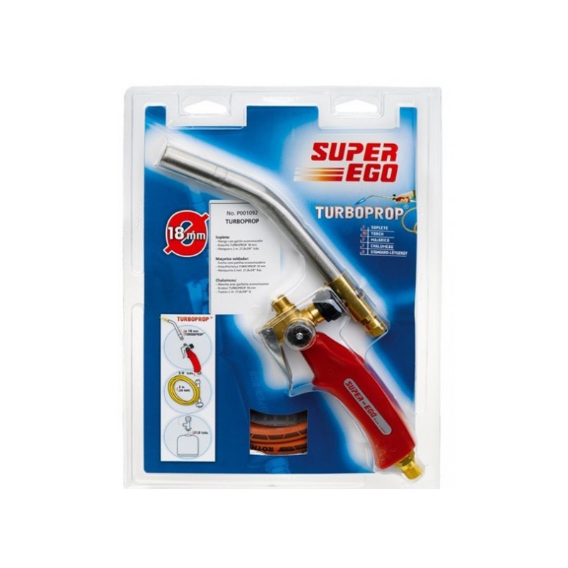 · Soplete a gas. · Modelo Turboprop. · Boquilla : ø 18 mm M14x1 · Fabricado en España. · Certificación CBZ-0092P Gas equipment directive 90/396/CEE. · W21,8"L -R3/8"L - 2 m. · Soldadura fuerte : ø 28 mm · Soldadura blanda: ø 54 mm. · Marca Super ego.