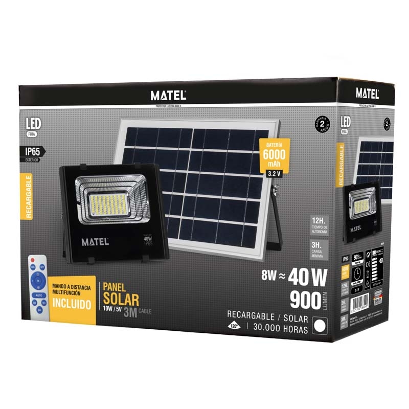 PROYECTOR LED SOLAR MATEL RECARGABLE 8-40W LUZ FRIA 6400K 900 LUMENS NEGRO