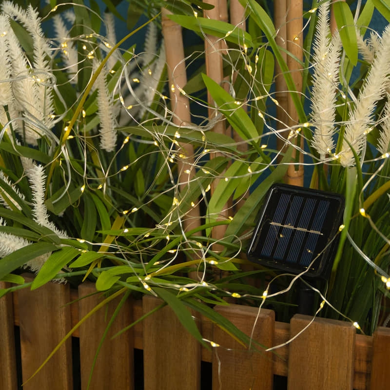 · Temperatura de color luz cálida 2700K · Autonomía: La guirnalda solar Cintia ilumina hasta 8h con una sola carga de 7h de luz directa. · Batería de larga duración 1800mAh y placa solar que proporciona un tiempo de iluminación prolongado. · Panel Solar Monocristalino: 0€ en tu factura. El panel solar de alta eficiencia carga durante el día y se enciende automáticamente por la noche. · Carga de día, Ilumina de noche: con sensor crepuscular que permite el funcionamiento automático, encendiendo la luz cuando detecta que anochece. · 8 modos de iluminación: cambia entre diferentes modos de flash en diferentes escenas según tus necesidades. · Impermeable y resistente al clima: Con resistencia al agua IP44, la guirnalda solar funciona sin tener que preocuparte por la lluvia, la nieve y las heladas.