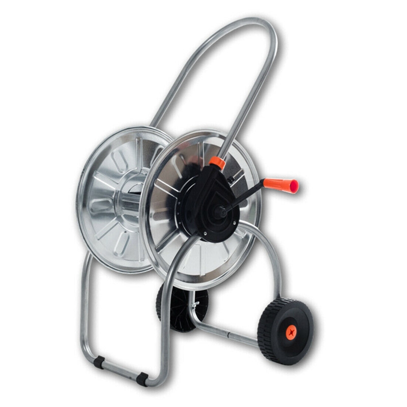 · Carro portamanguera. · Material acero zincado. · Capacidad para 50 metros de manguera medio pulgadas. · Soporte especial para la regulación del mango en altura. · Manivela de metal recubierta de resina.