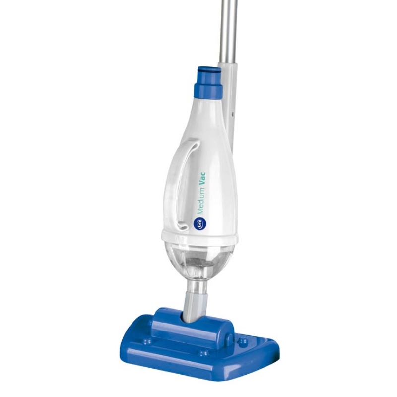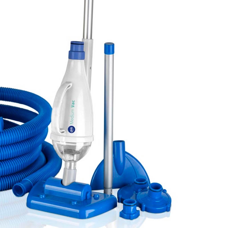 · Tipo de limpieza fondo. · Limpiafondos manuales. · Medium Vac es un kit de mantenimiento para piscinas auto-portantes o elevadas. · Funciona como un prefiltro donde las grandes partículas se quedan atrapadas y no pasan a la depuradora. · Incluye: limpiafondos aspiración cepillo, limpiafondos manual normal, pértiga de aluminio 2,4 metros (6 partes), 3 conectores (grande, mediano y pequeño), mabguera flexible de 9 metros de Ø32 milímetros y prefiltro.