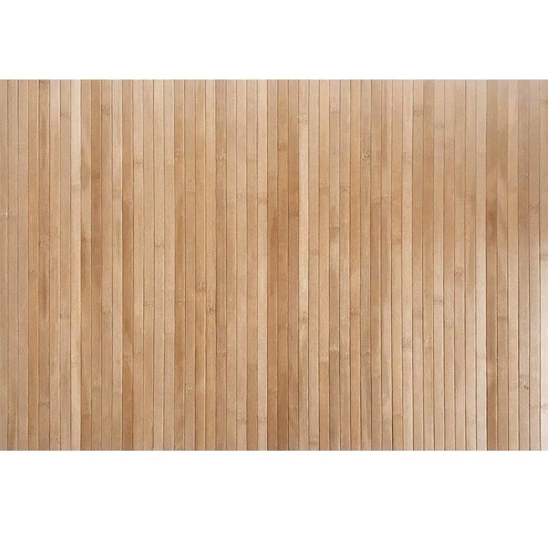 · Alfombra natural de bambú. · Acabado sin ribete, con corte pulido. · Efecto tarima. · Barnizado mate. · Dorso esponjoso de goma EVA. · Color Natur. · Medidas 140x200 cm.