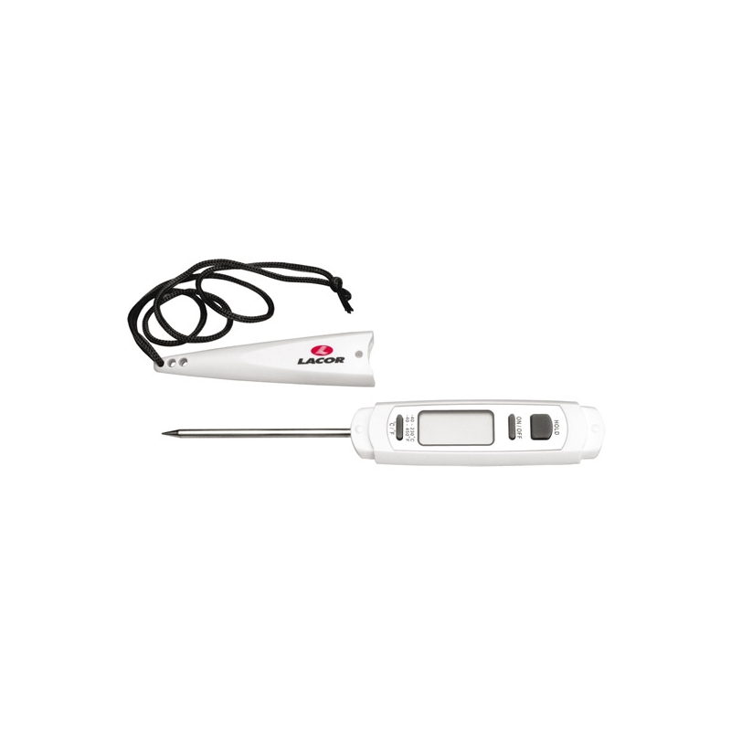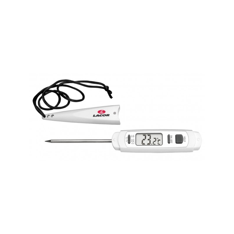 El term?metro electr?nico de Lacor le ofrece un dise?o moderno y de f?cil lectura para controlar la temperatura de sus alimentos. En la cocina es importante el control de la temperatura: la de los ingredientes antes de empezar a elaborar una receta, la temperatura a que se pone el horno, y la temperatura en la que un alimento alcanza su punto exacto de cocci?n, son tan importantes como la t?cnica utilizada y realzar?n o deteriorar?n los ingredientes. Recuerde que un term?metro no solo le ayuda a alcanzar el punto deseado en sus platos, tambi?n le asegura la higiene de sus alimentos. Aunque las temperaturas que se alcanzan al cocinar normalmente son suficientes para eliminar los microrganismos, no siempre el cambio de color o textura de un alimento cocinado garantiza que se hayan alcanzado temperaturas de seguridad: los alimentos cocinados deben superar los 70-75?C para evitar la contaminaci?n por microrganismos, especialmente en alimentos de riesgo alimentario como carnes, aves o huevos; las sobras tambi?n deben calentarse en temperaturas de higienizaci?n, por encima de 70?C. Por otro lado, el deseo de cocinar a temperaturas de seguridad a veces lleva a aplicar calor excesivo, perdiendo ternura y jugosidad, e incluso nutrientes.