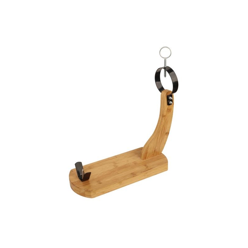 · Base y estructura fabricadas en bambú. · Herrajes fabricados en hierro pintado y los pinchos en acero cromado. · Base resistente con grosor de 2,5 cm. · Cabezal ajustable con tornillo y palometa a jamones de cualquier longitud. · Diseño de alta sujeción y durabilidad. · Ideal para piezas con tamaño estándar. Ideal tanto para los profesionales como para los aficionados al corte de jamón serrano, ibérico o el prosciutto italiano. · Anclajes para un corte seguro. · Patas anideslizantes. · Medidas 45 x 17,5 x 36 cm. · Peso 1,67 kg.