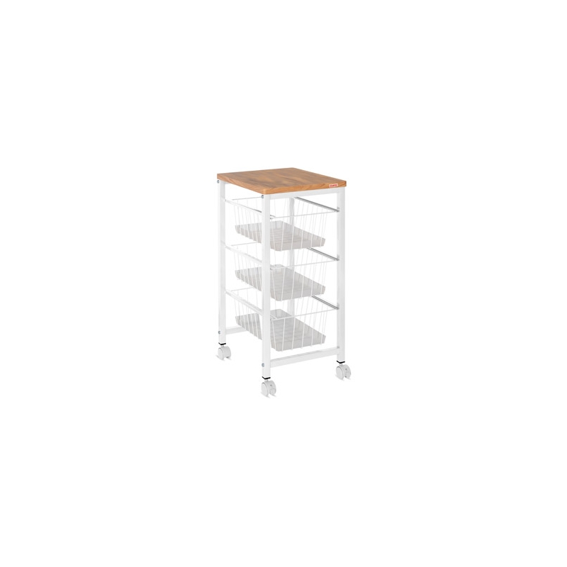 · Dispone de 3 cestas con opaline para el interior. · Superficie de madera de aglomerado chapado. que también puede servir para colocar cosas y aprovechar el espacio en la cocina. · Gracias a las ruedas en PP, las delanteras con freno,podrás desplazarlo sin esfuerzo para colocar alimentos o limpiar . · Metal satinado blanco. · Medidas: 30 x 37,7 x 68,4 cm · Requiere fácil montaje.