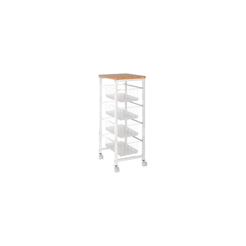 · Verdulero de acero con 4 cestas. · Estructura en epoxi. · Medidas: 30 x 37,7 x 86,7 cm · 4 ruedas en PP, las delanteras con freno. · Sobre madera de aglomerado chapado. · Requiere fácil montaje