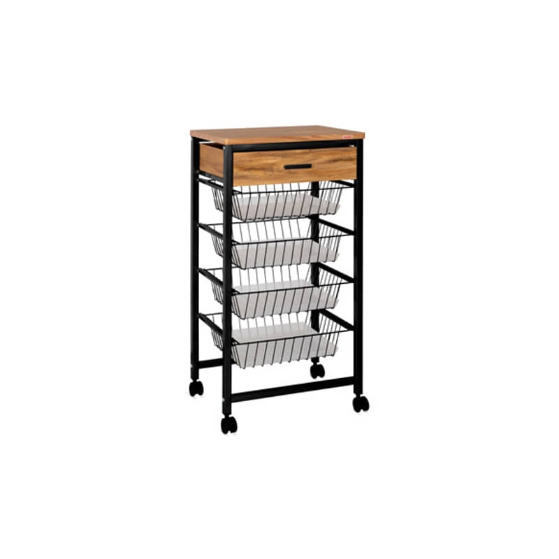 · Medidas: 43,5 x 33 x 88,4 cm · 4 cestas de acero. Bandejas de opaline para el interior. · 1 cajón de madera · 4 ruedas en PP, las delanteras con freno. · Sobre y cajon en madera de aglomerado chapado, extructura negro. · Requiere fácil montaje.