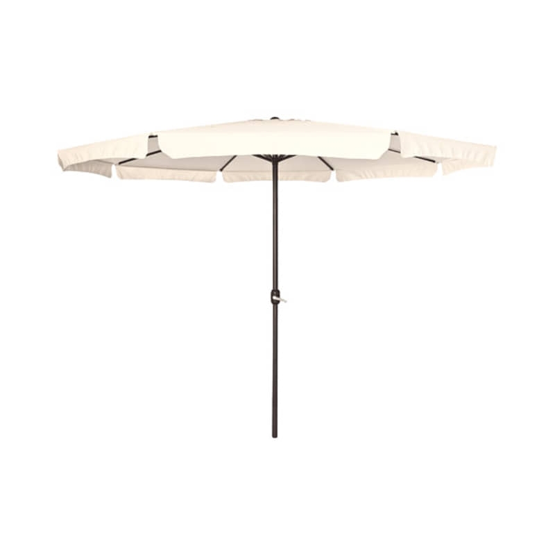 · Medidas Ø 3,5 m · Tejido poliéster 210 gr/m2 · Mástil de aluminio de color gris antracita, tubo Ø 48 mm · 8 varillas de acero de 12x18 mm. · Tela color beige. · Protección solar UV 50+.