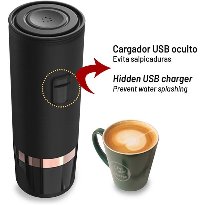 Prepara el café en 3-4 minutos a una presión de 20 bares de presión a una potencia de 90W. Dispone de doble función: prepara café frío y caliente y es compatible con cápsulas y café molido. Su interior es de acero inoxidable.La batería tiene un indicador luminoso de carga y tiene una autonomía de 30 tazas de café. La capacidad del depósito de agua es de 80 ml.