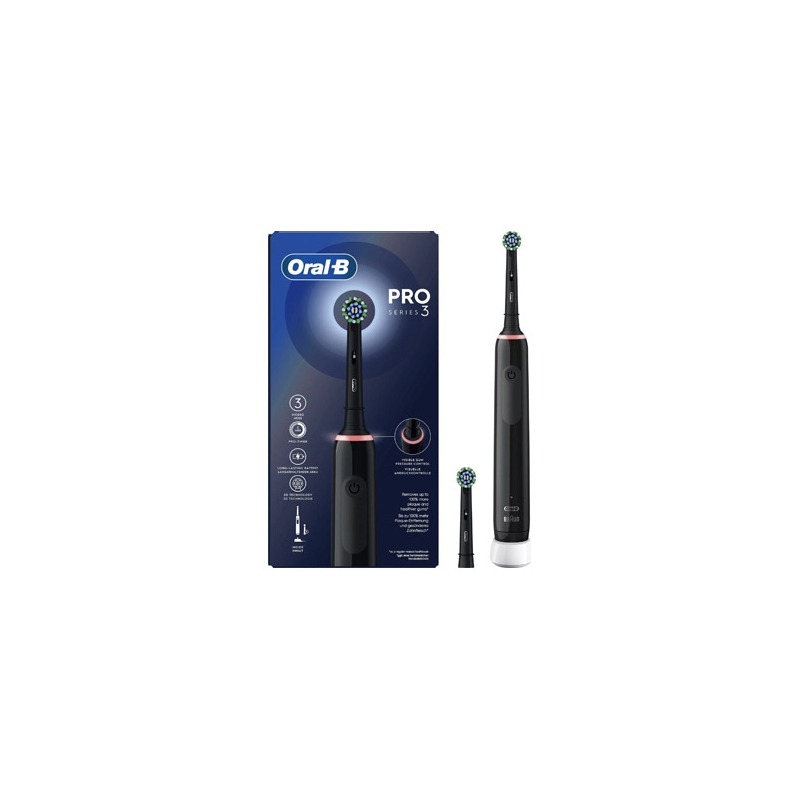 ? El Oral-B Pro 3 es el cepillo imprescindible para todo el que quiera cambiarse a un cepillo el?ctrico y mejorar su salud bucal. ? Limpieza profunda y enc?as m?s sanas gracias al control de presi?n de cepillado de enc?as de 360? que te avisa si te est?s cepillando demasiado fuerte. ? Para una limpieza fant?stica: mata las bacterias eliminando hasta un 100 % m?s de placa que un cepillo de dientes manual 3 modos de cepillado: limpieza diaria, blanqueamiento y dientes sensibles ? La bater?a de litio dura hasta 2 semanas con 1 carga ? Te ayuda a cepillarte durante m?s tiempo gracias al temporizador integrado de 2 minutos. ? Paquete que contiene 1 cepillo de dientes con cargador, 2 cabezales de repuesto.