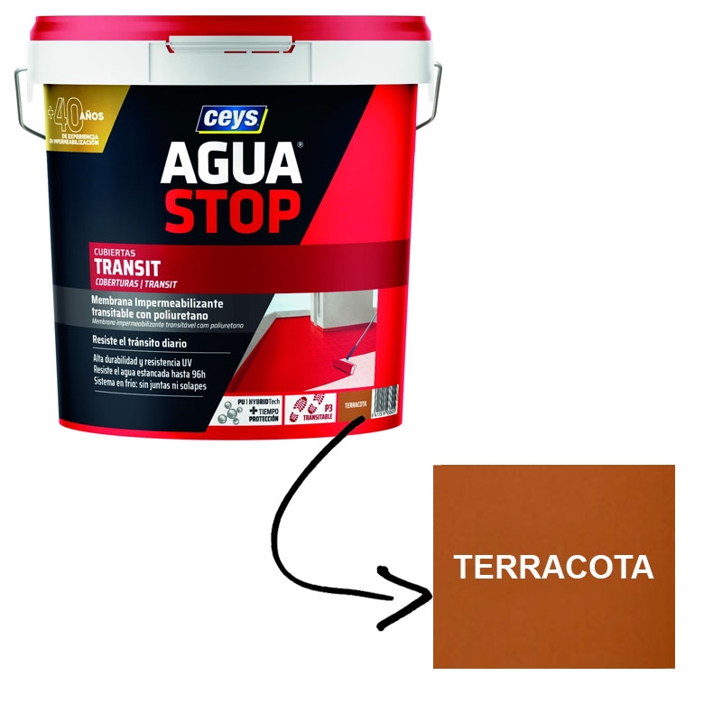 Agua Stop Transit es una membrana impermeabilizante para trabajos de impermeabilización en cubiertas, terrazas, azoteas y soladas. Su fórmula exclusiva Poliuretano Hybrid Tech le confiere mayor resistencia al desgaste y al tránsito, otorgando a la membrana mayor tiempo de duración. Permite el tránsito peatonal diario, sistema P3. Su textura aporta una gran capacidad de cosido de fisuras de hasta 3 mm sin necesidad de un tratamiento reconstructor previo.