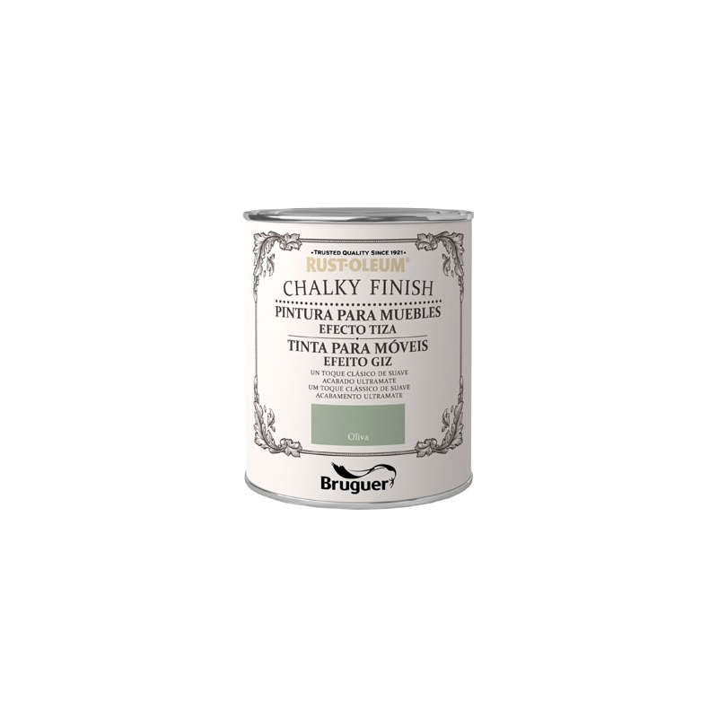 Cantidad: 750 ml Peso: 1,05 kg Marca: Xylazel Renueva tus muebles con Rust-Oleum Chalky Finish Pintura para muebles Xylazel Pintura al agua para muebles efecto tiza. Es una pintura ?divertida? que te permite conseguir diferentes acabados Al agua con m?nimo olor Acabado ultramate Efecto ?empolvado? Gran poder cubriente en una sola capa Sin necesidad de imprimaci?n en mayor?a de superficies Puede aplicarse sobre otros materiales como metal o pl?sticos con la imprimaci?n adecuada Secado: Tacto 1 h | Total 4 h Colores Blanco tiza | Blanco antiguo | Crema | Rosa antiguo | Teja | Cacao | Verde salvia | Oliva | Azul profundo | Grafito | Antracita | Gris invernal